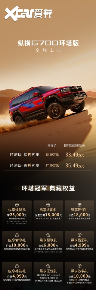纵横G700环塔版共推出2个版型,限时超级焕新价33.49万元—35.49万元,更有九重上市专属购车权益,旨在为用户更好的供给从购车、用车到玩车的全链路尊享体会。